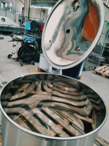 Il progetto in fotografia è stato realizzato per un cliente che si occupa di impianti e soluzioni per l’industria casearia. Si tratta di un chiusino ART 1091 dal diametro 1000 mm, sopra il quale è stato saldato un chiusino diametro 150 mm per l’ispezione. Inoltre, sono stati fatti tre fori di differenti dimensioni sul coperchio che serviranno al cliente per applicare ulteriore componentistica. La parte interna del telaio è fornita con finitura BA.